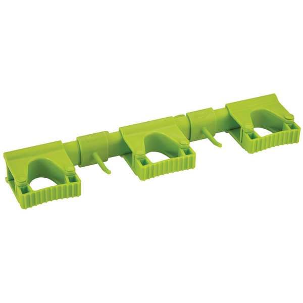 Tool Wall Bracket, Color Lime, For Product Type Janitorial Tools, For Handle Diameter 1/16 in, Overall Length 16 1/2 in, Overall Width 3 3/8 in, Overall Height 1 7/8 in, Overall Depth 16 1/2 in, Holds (2) Handles with Holes, (3) Handles/Poles, FDA Compliant Yes, Features Modules Cannot Slide from Side to Side, The Rail Easily Attaches to the Four Wall Mounts, Material Polyamide, Polypropylene, TPE Rubber, Mounting Location Wall