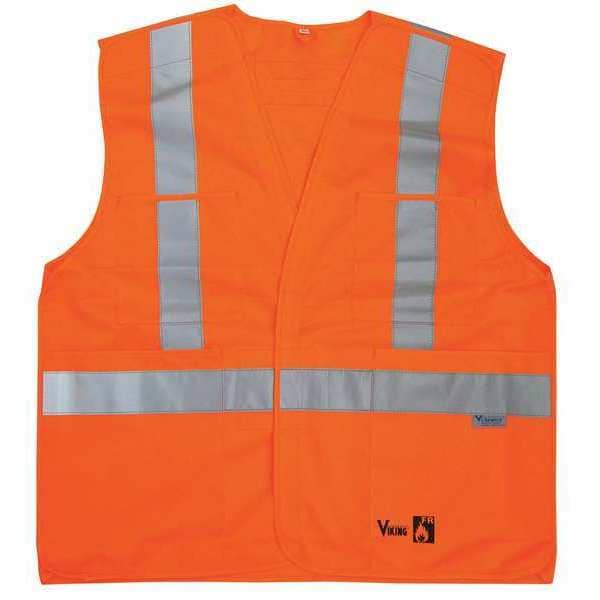 Flame Resistant High Visibility Vest, ANSI Class 2, Vest Size L, XL, Traffic Safety Vest Color Orange/Red, Fits Chest Size 45 in, Gender Men's, Stripe Color Silver, Vest Material Polyester Mesh, Vest Closure Type Hook-and-Loop, ATPV Rating FR ASTM F2302-09, Hazard Risk Category (HRC) 0, Vest Stripe Color Family Orange/Red/Silver, Back Stripe Pattern X, Vest Length 28 in, Number of Pockets (Inside) 0, Number of Pockets (Outside) 4, Number of Pockets with Closure 2