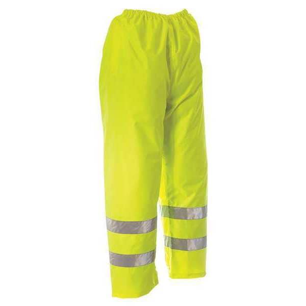 Hi-Visibility Rain Bib Pants, Material 150D Rip-Stop Polyester, Polyurethane, Gender Men's, Size S, Color Gree/Yellow, Inseam 31 in, Maximum Waist Size 30 in, High-Visibility Yes, ANSI Class E, Number of Outside Pockets 0, Includes Lining Yes, Lining Material Polyester, Ankle Type Hook-and-Loop, Fabric Weight 13.5 oz, Style Rain Pants, Fly Closure Type Hook-and-Loop, Waist Closure Drawstring, Reflective Stripe Border Type None