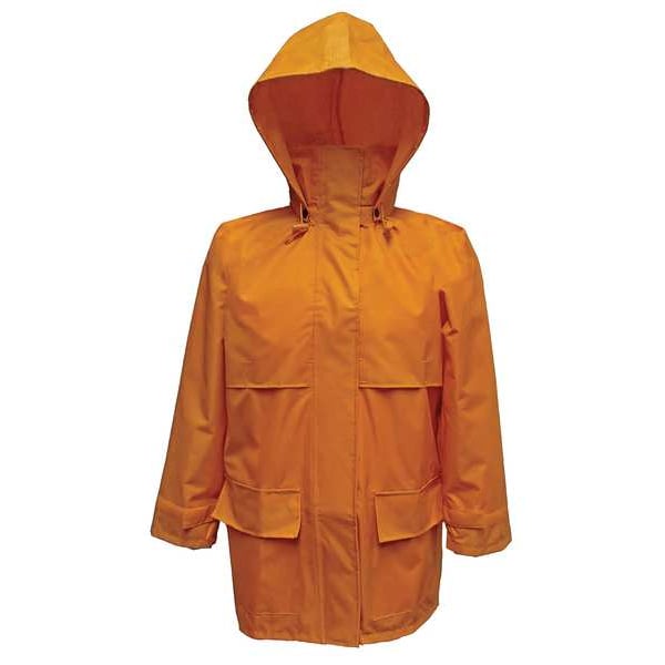 Rain Jacket with Hood, Style Rain Jacket, Size L, Number of Inside Pockets 0, Number of Outside Pockets 2, Color Yellow, Front Closure Type Hook-and-Loop, Zipper, Gender Men's, Material 150 Denier Rip-Stop Polyester, High-Visibility No, ANSI Class Not Rated, Includes Hood Yes, Hood Style Attached, Length 33 in, Lining Material Polyester/PVC, Features Wind Resistant, Cuff Style Hook-and-Loop