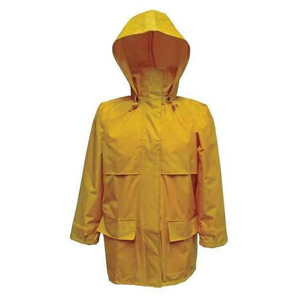 Rain Jacket with Hood, Style Rain Jacket, Size 4XL, Number of Inside Pockets 0, Number of Outside Pockets 2, Color Yellow, Front Closure Type Double Storm Flap, Hook-and-Loop, Zipper, Gender Men's, Material Polyester, High-Visibility No, ANSI Class Not Rated, Hood Style Attached, Length 34 in, Includes Lining Yes, Maximum Chest Size 58 in, Lining Material Polyester, Features Double Stitched, Heat Sealed Seams to Maximize Waterproofness, Taped, Standards ANSI/ISEA 107-2015