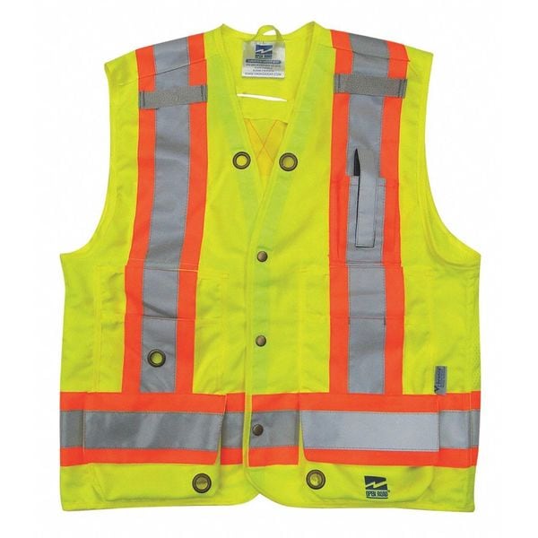 Surveyor Vest, ANSI Class 2, Vest Size M, Traffic Safety Vest Color Yellow/Green, Fits Chest Size 40 in, Gender Men's, Stripe Color Silver, Vest Material Polyester Mesh, Vest Closure Type Snap, ATPV Rating Not Rated, Hazard Risk Category (HRC) 0, Vest Stripe Color Family Silver, Back Stripe Pattern X, Vest Length 30 in, Number of Pockets (Inside) 3, Number of Pockets (Outside) 9, Number of Pockets with Closure 8