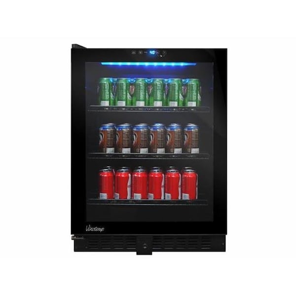 The stylish VT-54 Touch Screen Beverage Cooler by Vinotemp is perfect for those who love to entertain. With its seamless, all-glass technology, this unit allows you to house approximately 120 12 oz cans. It features distinctive black racking, which is a patent pending Vinotemp design exclusive. A digital touch screen control panel at the top of the door allows you to adjust the temperature of the cooler without having to open the door. A soft blue glowing LED light highlights the cooler's contents and creates a gorgeous display. This unit is the perfect companion for the VT-54TS wine cooler.