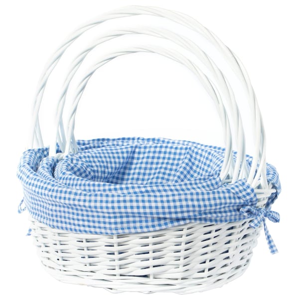 White Round Willow Gift Basket, with Blue Gingham Liner and Handle- Set of 3