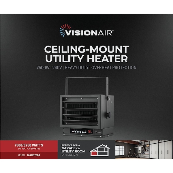 Introducing the Vision Air Ceiling Mount Heater your solution to efficient and space-saving warmth. With a focus on maximizing your usable floor space this heater is perfectly suited for garages workshops or any area where conserving space is as important as staying warm. Its robust construction ensures durability and longevity offering you reliable heat for seasons to come. The user-friendly design makes it a breeze to achieve the ideal temperature providing not just warmth but peace of mind. Whether youre tackling projects in the cold enjoying your hobby space or simply looking to add comfort to your area the Vision Air Ceiling Mount Heater delivers consistent dependable warmth with an effortless elegance that fits seamlessly into any space.