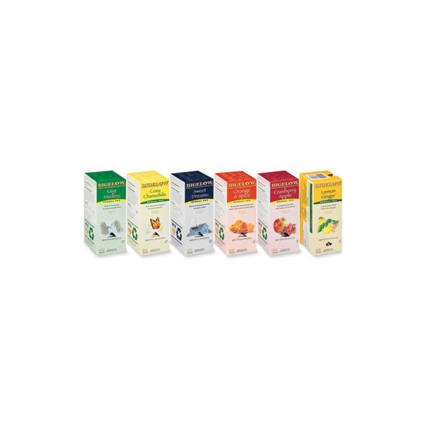 Use this six-tea assortment to pick the type of herbal tea that best suits your mood. Bags are individually foil wrapped, helping to retain freshness. Beverage Type: Tea; Flavor: Assorted Herbal; Packing Type: Tea Bag; Assortment: Cozy Chamomile; Cranberry Apple; Lemon Ginger; Mint Medley; Orange Spice; Sweet Dreams.