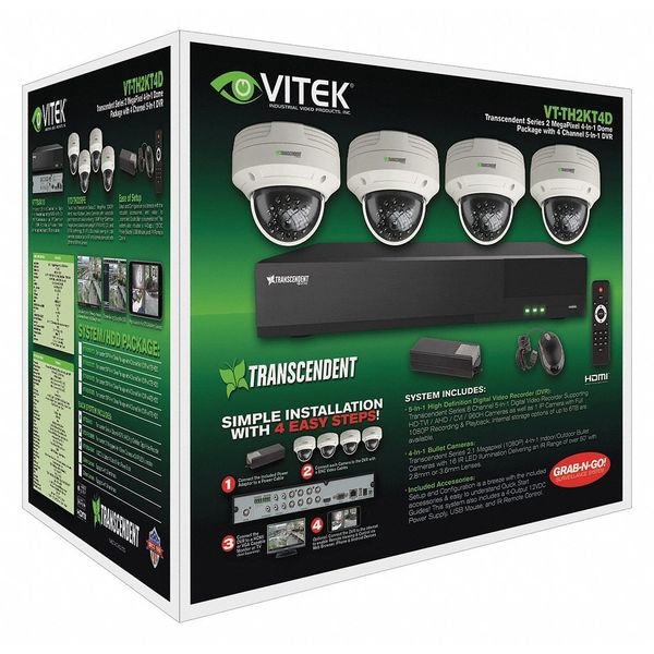 Digital Video Recorder Kit, Fixed, Cable Type Coaxial, Camera Height 3-37/64 In., Camera Length 3-1/4 In., Camera Resolution 1920 x 1080, Camera Voltage 12VDC, Camera Width 2-1/2 In., Camera Diameter 4-37/64 In., DVR Depth 10 In., DVR Height 2 In., DVR Width 10 In., Focal Length 3.60mm, For Use With Mfr. No. VT-TJB03, Format Type PAL/NTSC, 1 TB Hard Drive Size, Includes (4) Dome Cameras, DVR, Power Supply, Fixed Lens, Min. Light Level 0 Lux (IR On), Mount Ceiling, Surface, or Wall