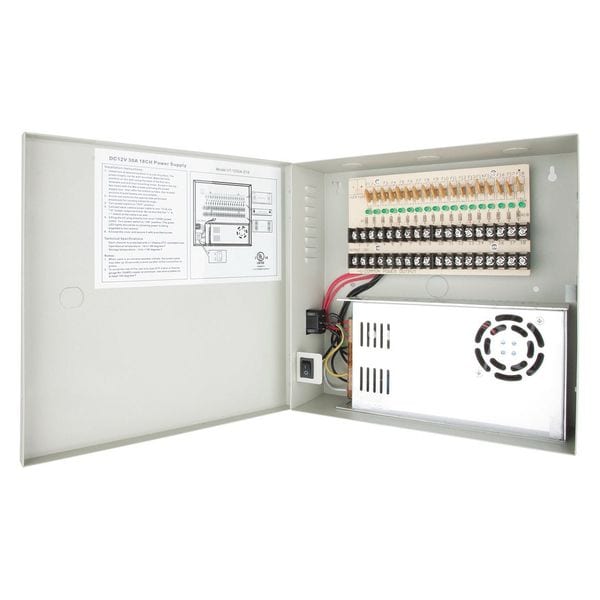 Power Supply, Number of Channels 18, Overall Height 10 1/4 in, Overall Width 10 5/8 in, Overall Depth 3 1/8 in, VA Rating 40 VA, Maximum Input Voltage 110/220V AC, Maximum Output Voltage 12V DC, For Use With CCTV Cameras, Input Type No Inputs Included, Output Type No Outputs Included, Color Ivory, Features Lock on Power Outlet Screw, PTC Resettable Fuse, Includes (18) Output Terminal Strip Connections, Standards UL Listed