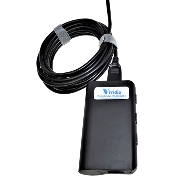 The Vividia BD-5030i Borescope is a semi-rigid USB borescope with a 4.8mm 0.19in diameter probe head, 3.5 meter 11' long semi-rigid probe tube and USB output for iPhone, iPad &Android devices. There are two independent cameras on the 0.19in/4.8mm diameter probe, one with a front view 0 degree and another with a side view 90 degree. One can switch between the two cameras using the free app for iPhone, iPad or Android devices. LED brightness can be adjusted. One can seamlessly record picture and video directly to their phone within the app. The Vividia BD-5030i dual-camera borescope can be used for applications like precision instrument inspection, aircraft engine inspection, automotive repair, plumbing, construction, restoration and HVAC/R.
