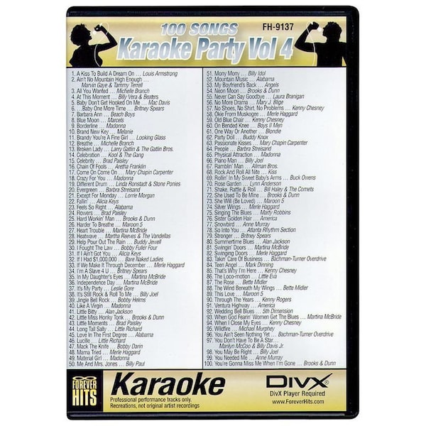 KARAOKE PARTY DIVX DVD VOL 4 DIVX DVD contains 100 karaoke songs on a single disc 5 different volumes available each sold separately Requires DIVX compatible DVD player