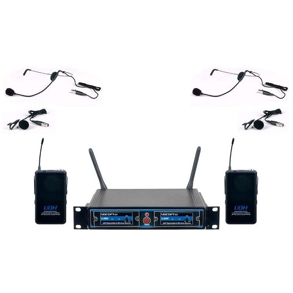 Includes 2 Bodyback Transmitters w/2 Headset mics & 2 Lapel mics.All-in-one wireless Mic-On-IC has a pre-amp, compressor, & expander onboard.Uses proven analog UHF transmission technology for better range & reliability.Plug & Play design requires no microphone syncing set-up.Comes w/either 2 handheld microphonesUDH-DUAL-H or 2 bodypacks w/headset micsUDH-DUAL-B.Quickly scale up to 4 microphone channels by attaching an additional UDH receiver w/no tools required.Rear Panel Connectors:Power inXLR channel 1 outXLR channel 2 out1/4-in unbalanced out