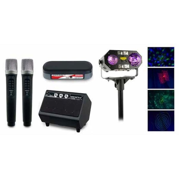 Looking for a new way to entertain at home? With more travel restrictions and people staying home now more than ever, VocoPro's new Smart TV stay-at-home karaoke package lets you enjoy karaoke club and bar like entertainment in the comfort of your own home.The core of the system is the SmartTVOke, just connect to an internet enabled smart TV's headphone or optical output to stream thousands of songs on YouTube or karaoke apps.System includes two wireless microphones operating in the digital 2.4 GHz. Duet singers can tune in their own settings with independent volume and effect controls directly from the keypad on the microphone.Sing like a Rockstar with the included 100W powered monitor speaker, and light up the night with the smart light show five-effect-in-one DJ lightThis package comes with everything you need, and makes it super easy to put together club/bar like karaoke entertainment in the comfort of your own home. New generation digital karaoke mixer for the ultimate sound and karaoke entertainment Compatible with any source with a digital optical output PCM Only and sound systems with a 1/8'' stereo or RCA input Use any analog music source with the 1/8'' Input 100W 2.1 Monitor with Stereo Speaker and subwoofer to make your voice and music powerful Compact all metal professional five-in-one effect light with Moonflower, Water Wave, Strobe, UV/Black Light, Laser. Red