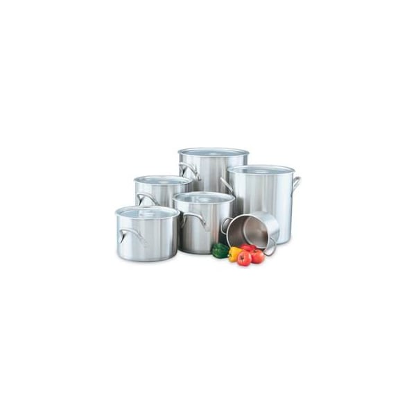 English and metric on inside walls. Nsf certified. Carbon steel core bonded with layers of 18-8 stainless steel. Solid welded stainless steel handles for durability and easy cleaning. Liquid measure capacities chemically etched in english and metric on inside walls. For use with conventional or induction ranges. Stainless steel interiors clean easily and will not react with food. Covers sold separately. 14" diameter. 38-1/2 quart capacity.