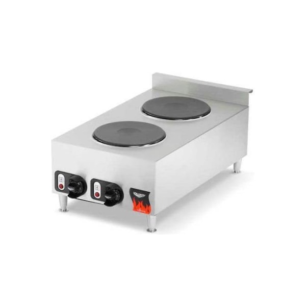 Vollrath, electric hot plate, 40739, 9" solid burners, 24" x 24" x 26" features: 9" solid plate burners (front-back) for faster heatingand easier cleanup stainless steel construction for durability and long life rear safety skirt adjustable heavy-duty legs - 4" (10.2 cm)- 5-1/2" (14 cm) adjustment range narrow footprint for tight counter spaces all units ship with cord and plug installed