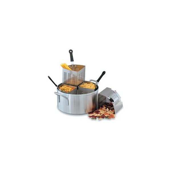 Pasta and vegetable cooker 18-1/2 qt. Complete set aluminum pot, steel inserts. Includes 18.5 qt. (17.5 l) 3004 aluminum pot and four perforated 18-8 stainless steel inserts. Inserts (3 qt. / 2.9l) hold up to 3 servings of pasta. Perfect for blanching vegetables. Hanging clip for easy draining. Inserts: riveted plated steel handles with gatorgrip - rated at 450f (232c) stay cool to the touch. Pot: welded handles for easy clean-up and durability. Hole diameter: 3/16" (0.5 cm).