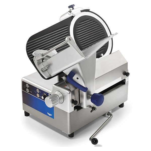 Food Slicer, Blade Diameter 12 in, Maximum Slice Thickness 13/16 in, Overall Height 24 7/8 in, Overall Width 22 5/8 in, Overall Depth 27 in, Current 4 A, Voltage 120V, Horsepower 1/2 hp, Cord Length 76 in, Features 35 Degrees Gravity Feed, Belt Driven, Kickstand, Removable Carriage, Frequency 60 Hz, Includes Safe Blade Removal Tool, Material Anodized Aluminum, Stainless Steel, Number of Speeds Variable, Plug Type 5-15, Standards cULus, NSF/ANSI 8 Certified, UL EPH Classified, Weight 115 lb