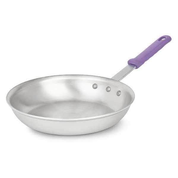 Fry Pan, Handle Material Silicone, Handle Color Purple, Oven Safe No, Product Type Fry Pan, Body Color Silver, Body Material Aluminum, Bottom Diameter 7 5/8 in, Bottom Material Aluminum, Dishwasher Safe No, Finish/Coating Natural, Gauge 8 ga, Handle Type Riveted, Non-Stick No, Overall Height 3 13/16 in, NSF Certified Yes, Top Diameter 10 in