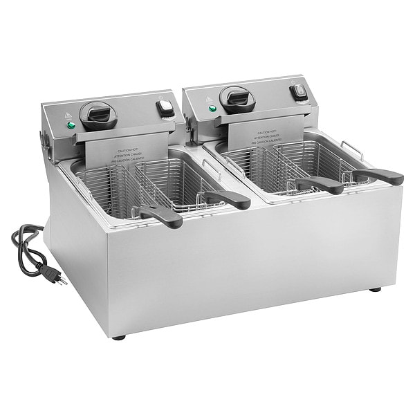 Fryer, Capacity 10 lb, Number of Fry Pots 2, Overall Height 12 5/8 in, Overall Width 23 in, Overall Depth 17 1/8 in, Material Stainless Steel, Heating Capacity Not Applicable, Maximum Operating Temperature 375 Degrees F, Voltage 120V AC, Tank Capacity Not Applicable, Includes (4) Wire Baskets, Plug Type 5-15P, Power Source Electric, Wattage 1,800 W