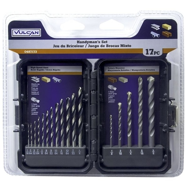 Plastic Case Handyman's Drill Bit Set includes 17 pieces. All sizes 3/16 in and larger have 3 flats on the shank so that the drill chuck gets a better grip on the drill bit.