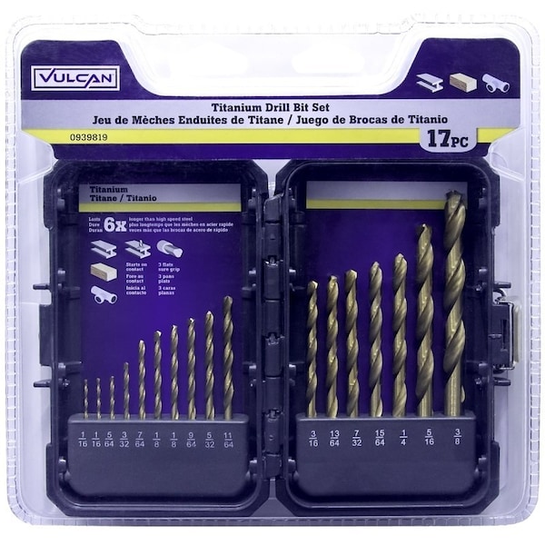 Drill Bit Set, 17-Piece, High Speed Steel/Titanium Nitride, Bright Yellow