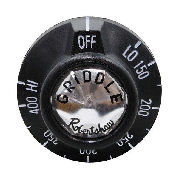 Bj T'Stat Knob, Black;[ 1-15/16" Dia ] [ Off-Low-150-400-High] ;[Mount 11/16" Dia.] [Notch Down ], 1" Protrusion.;Comstock Castle Griddle;Garland Griddle H280, P280;Montague Griddle 2436, 2436T, 2472, 2472T;Grizzly Series "G", Montague Ii "R"