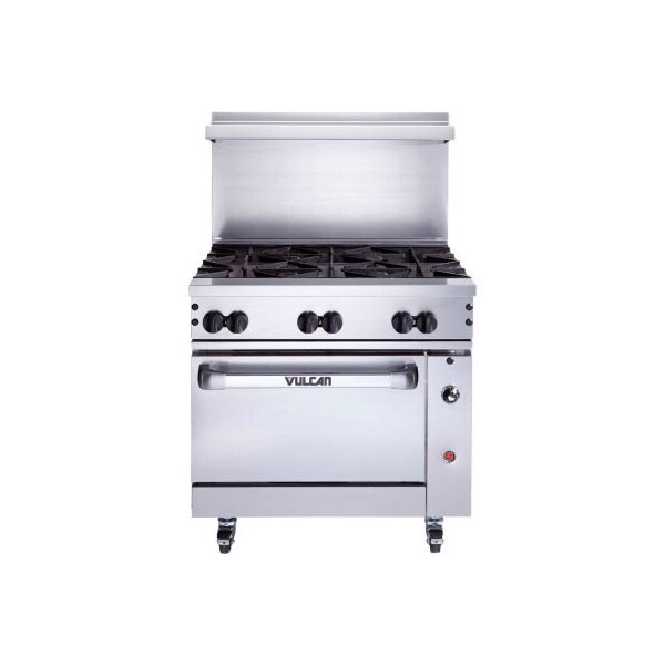 Vulcan 36s-6bp, endurance range, standard oven, propane features: stainless steel front, sides, backriser, lift-off high shelf 6" stainless steel adjustable legs shrouded flash tube pilot system (one pilot per two burners) heavy-duty cast grates, easy lift-off extra deep grates in back accommodate large pans or stock pots extra deep pull out crumb tray with welded corners to contain liquids 35,000 btu/hr. Baker's depth standard oven cavity full size sheet pans fit side-to-side or front-to-back oven thermostat adjusts from 250f to 500f two oven racks and four rack positions