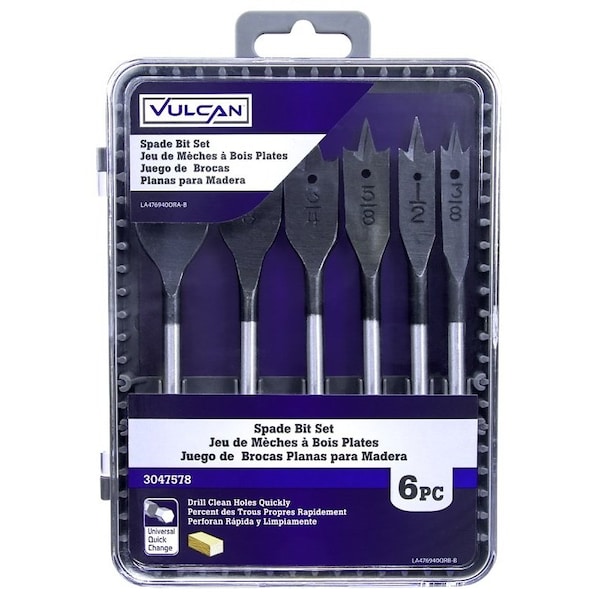 Wood Spade Drill Bit Set includes 6 pieces, 3/8 - 1 in range. For fast and rough drilling in wood and wood composite products.