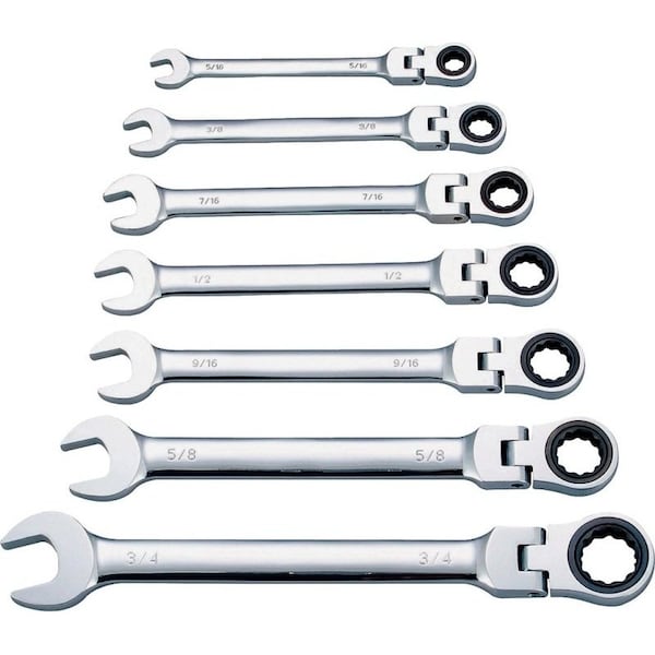 This wrench set includes 5/16 in, 3/8 in, 7/16 in, 1/2 in, 9/16 in, 5/8 in and 3/4 in sized wrenches. Its flex head tilts up to 180 deg, allowing access to the narrowest of working areas. The 72 tooth ratcheting box-end with 5 deg of arc is ideal in tight space conditions. The set is made of drop forged chrome vanadium steel with a mirror polish.