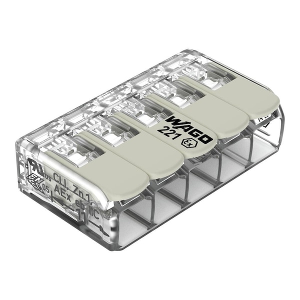 Push-In Wire Connector, Color Gray, For Conductor Material Copper, For Minimum Wire Size - Stranded 24 AWG, For Maximum Wire Size - Stranded 12 AWG, Housing Material Polycarbonate, Maximum Operating Temperature 221 Degrees F, Maximum Voltage 440 V, Overall Height 0.33 in, Overall Length 0.73 in, Overall Width 1.18 in, Connector Type Lever, UL 94 Flammability Rating V-2, Number of Ports 5, RoHS Compliant Yes, Standards AEx, ATEX, CCA, CCC, CCCEx, EAC, ENEC 05, IECEx, LR, UL, Contact Finish Tin