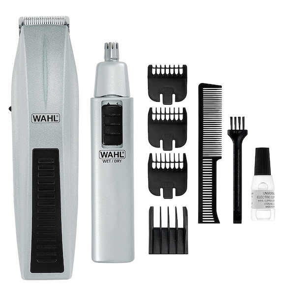 Have all your hair trimming essentials with this Wahl Mustache and Beard Battery Trimmer. This kit includes a battery operated mustache and beard trimmer as well as a bonus battery operated nose and ear trimmer. The beard trimmer comes with 3 beard guide combs, a 5 position adjustable guide comb, mustache comb, blade oil, and a cleaning brush. Being battery operated, this trimmer is perfect for travel and stores away easily thanks to there being no pesky wires. Have you own professional salon and barber trimmer right in the comfort of your own home.