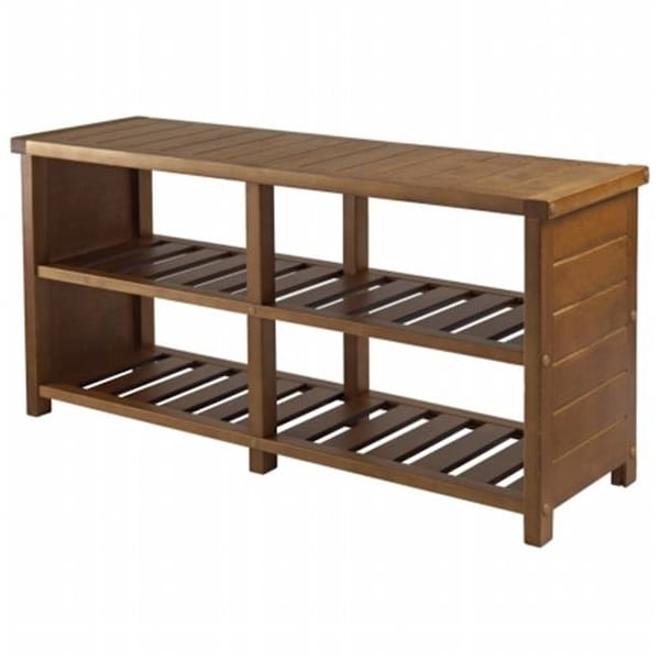 Organize your shoes in your closet, bedroom or entryway with the . For closet, use top seat as extra shelf to stack clothes or place more shoes. Top dimension 38.43"W x 11.81"D. Bottom two slated shelves has four sections with each dimension about 17.15"W x 11"D x 7.2"H. Made of Combination of Solid and Composite wood in Teak Finish. Assembly Required.Dimensions: Width: 38.39 Depth: 11.81 Height: 18.27 Materials: Solid / Composite Wood Color: Teak