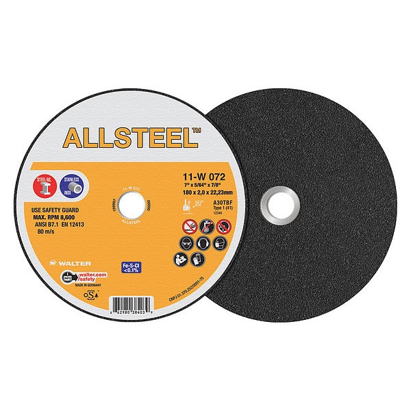 Abrasive Cut-Off Wheel, Abrasive Wheel Type Type 1, Abrasive Wheel Diameter 7 in, Thickness 0.0781 in, Arbor Hole Size 7/8 in, Max. RPM 8,600 RPM, Application Stainless Steel, Steel