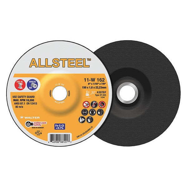 Abrasive Cut-Off Wheel, Abrasive Wheel Type Type 27, Abrasive Wheel Diameter 6 in, Thickness 0.0625 in, Arbor Hole Size 7/8 in, Max. RPM 10,200 RPM, Application Stainless Steel, Steel