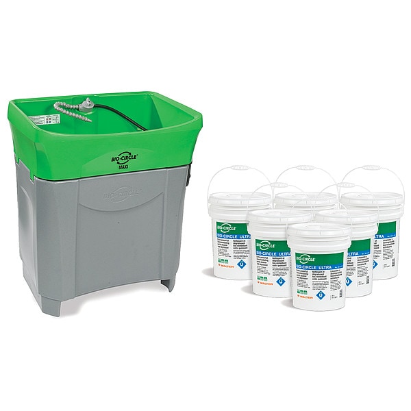 Parts Washer, For Solution Base Type Water-Based (Microbial), Cleaning Method Bioremediation, Flush, Manual, Tank Material Plastic, Tank Capacity 36 gal, Maximum Fluid Level 10 in, Load Capacity 500 lb, Tank Overall Width 20 in, Tank Overall Depth 24 in, Tank Overall Height 29 3/4 in, Minimum Operating Temperature 104 Degrees F, Maximum Operating Temperature 106 Degrees F, Voltage 120V, Horsepower 1/40 hp, Standards CSA Certified, Cleaning Solution Included (6) 5.2 gal Pails Bio-Circle ULTRA