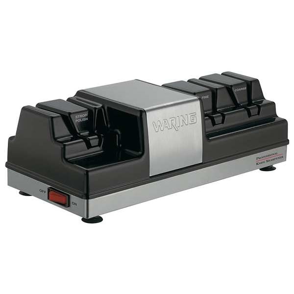 Knife Sharpener, Grit Type Coarse; Fine, Number of Stages 3, Application Sharpens Serrated Knives, Sharpens Straight Edge Knives, Depth 5 3/4 in, Features Grinds at 18-22 Degrees Angles, Magnetized Drawer Captures Metal Shavings, Includes (2) Grinding Wheels, Stropping Wheel, Knife Style Sharpened Kitchen Knives, Overall Height 4 1/4 in, Overall Width 12 1/2 in, Product Type Electric Knife Sharpener, NSF Certified Yes