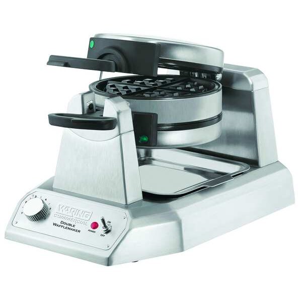 Double Waffle Maker, Material Aluminum, Cooking Surface Width 7 in, Overall Height 9 1/2 in, Overall Width 10 1/2 in, Overall Depth 17 in, Wattage 1,400 W, Plug Type 5-15, Current 12 A, Features Embedded Heating Elements for Precise Temperature Control, Independent Ready Lights and Audio Beep Signal When Waffles are Ready to Serve, Rotary Feature for Even Baking of Two Waffles at Once, Includes Measuring Cup, Power Source Electric, Standards cETLus, NSF, Voltage 120V AC