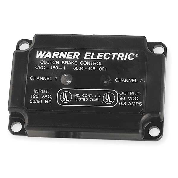 Clutch/Brake Control, Product Type Clutch/Brake Control, Overall Length 3.33 in, Overall Width 2.19 in, Overall Height 0.56 in, Input Voltage 120V AC, Output Voltage 90V DC, Frequency 50 Hz, 60 Hz, Mounting Location On Conduit Box, For Use With All Series 90V Clutch/Brakes, Maximum Ambient Temperature 45 Degrees C, Minimum Ambient Temperature -20 Degrees C, Standards UL Listed