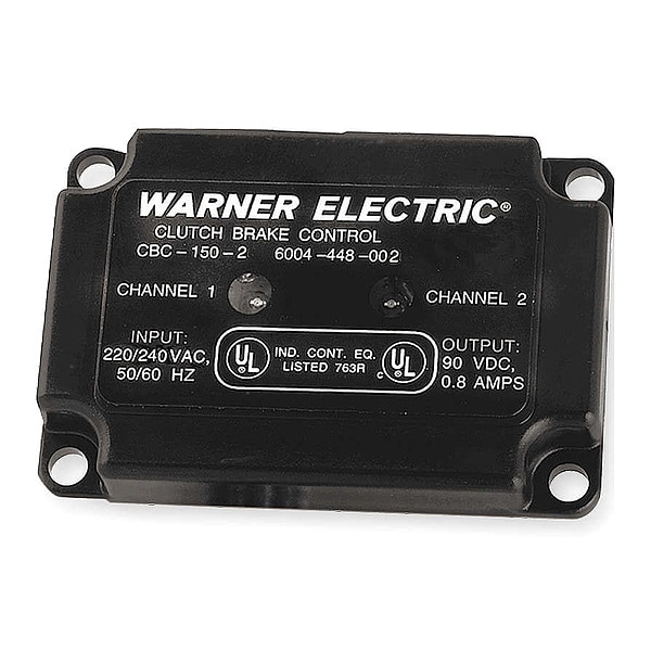 Clutch/Brake Control, Product Type Clutch/Brake Control, Overall Length 3.33 in, Overall Width 2.19 in, Overall Height 0.56 in, Input Voltage 220-240V AC, Output Voltage 90V DC, Frequency 50 Hz, 60 Hz, Mounting Location On Conduit Box, For Use With All Series 90V Clutch/Brakes, Maximum Ambient Temperature 45 Degrees C, Minimum Ambient Temperature -20 Degrees C, Standards UL Listed