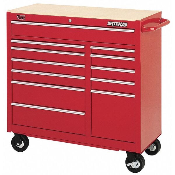 Rolling Cabinet, Series TRAXX, Industrial, Heavy Duty Series, Width 41 in, Depth 18 in, Height 41 in, Number of Drawers 12, Red, Drawer Capacity 75 lb., Full Extension Ball Bearing Drawer Slides, Gloss Finish, Storage Capacity 15,961 cu. in., Load Rating 1200 lb., Caster Size 5 in x 2 in, Steel, 20 Gauge, Work Surface Material MDF, Caster Wheel Material Plastic, Caster Type (2) Fixed with Lock, (2) Swivel, Internal Keyed Lock, Tubular Metal Side Handles