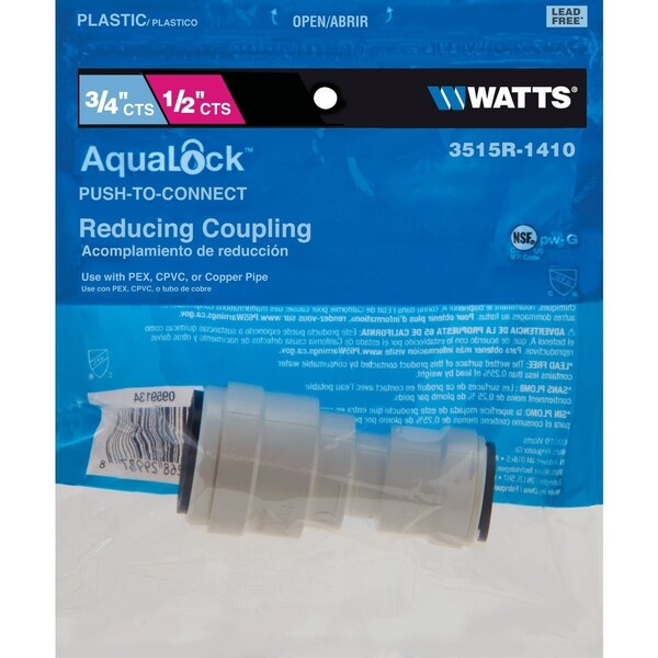 CTS quick reducer connect coupling (push type) for PEX copper CPVC and potable plumbing pipe. Can be easily disconnected and reused without any tools. Approved for behind the wall and underground installations without the use of access panels (always check local codes). Holds up to 250 P.S.I. at 75 deg. F. IAPMO NSF 61 CSA/ASTM and UPC Code Approved.
