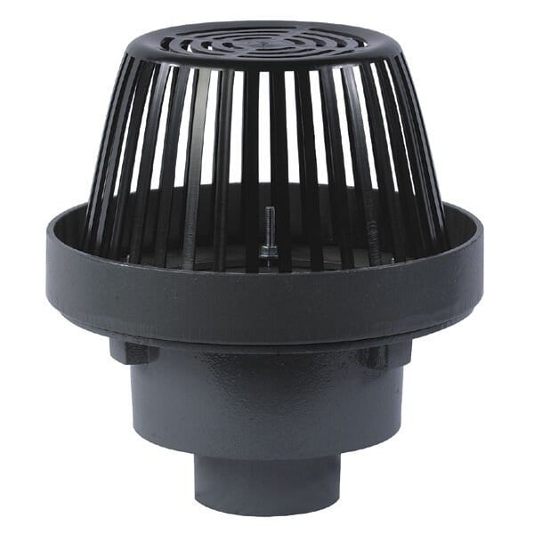 This Watts Drains epoxy coated, cast iron, overflow roof drain features and flashing clamp with an integral 2 inch high external water dam, a self-locking polyethylene dome, 137 square inches of free area and a 6 inch no hub outlet.
