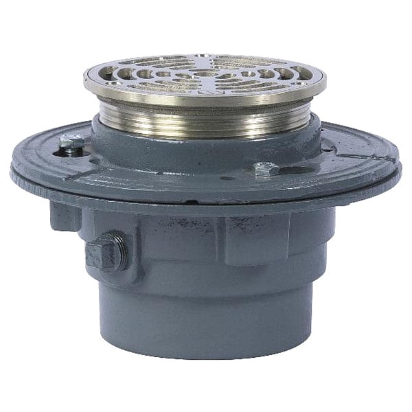 Floor Drain, Includes Strainer Yes, Includes Grate Yes, Nominal Pipe Size 4 in, Pipe Outside Diameter 4 in, Drain Material Cast Iron, Includes Round Strainer, Connection Type No Hub, Ligature Resistant No, Body Height 3 1/4 in, Product Type Floor Drain, Drain Style Round, Grate Material Nickel Bronze, Overall Diameter 4 1/4 in, Body Diameter 4 in, Overall Height 3 1/4 in