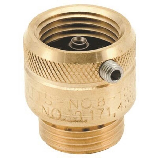 This 3/4 in. hose connection vacuum breaker permits the attachment of portable hoses to hose thread faucets and prevents the reverse flow of polluted water into the potable water supply due to backsiphonage. It consists of a brass body construction, stainless steel working parts, and a rubber diaphragm and disc. It is secured with allen head set screw. It is ideal for inside and outside, health hazard installations requiring non-continuous pressure such as service sinks, swimming pools, photo developing tanks, laundry tubs, wash racks, dairy barns, marinas, and general outside gardening uses. Check with local inspection authorities for installation requirements. Maximum pressure is 125 psi 8.6 BAR.Brass bodyDurable rubber diaphragm and disc for consistent positive seatingAllen set screwIncludes rubber diaphragm and disc and draining stemDesigned to prevent the backflow of polluted water from entering into the potable water supplyIdeal for inside and outside, health hazard installations requiring non-continuous pressure such as service sinks, swimming pools, photo developing tanks, laundry tubs, wash racks, dairy barns, marinas, and general outside gardening usesMaximum pressure is 125 psi