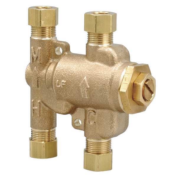 Mixing Valve, Body Material Brass, Flow Rate 0.5 to 2.5 gpm, Inlet Type Compression, Outlet Type Compression, Inlet Size 3/8 in, Outlet Size 3/8 in, Temp. Range 80 Degrees to 120 Degrees F, Max. Pressure 150 psi, Overall Height 3 3/8 in, Overall Width 3 3/16 in, Inlet Temperature (Cold) 39 Degrees to 80 Degrees F, Inlet Temperature (Hot) 120 Degrees to 180 Degrees F, Standards ASSE 1070