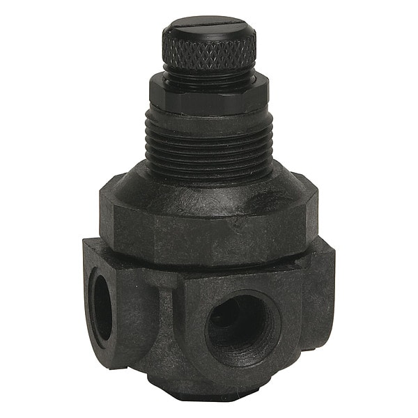Pressure Regulator, Series P60, Body Material Thermoplastic, Inlet Size 1/4 in, Outlet Size 1/4 in, Length 2 in, Height 3 in, Application Commercial Use, Industrial Use, Residential Use, Pressure Adjustment Range 0 to 125 psi, Gauge Port Size 1/4 in, Seal Material Buna-N, Max. Temp. 150 Degrees F, Pipe Size 1/4 in, Max. Pressure 300 psi, Standards NSF