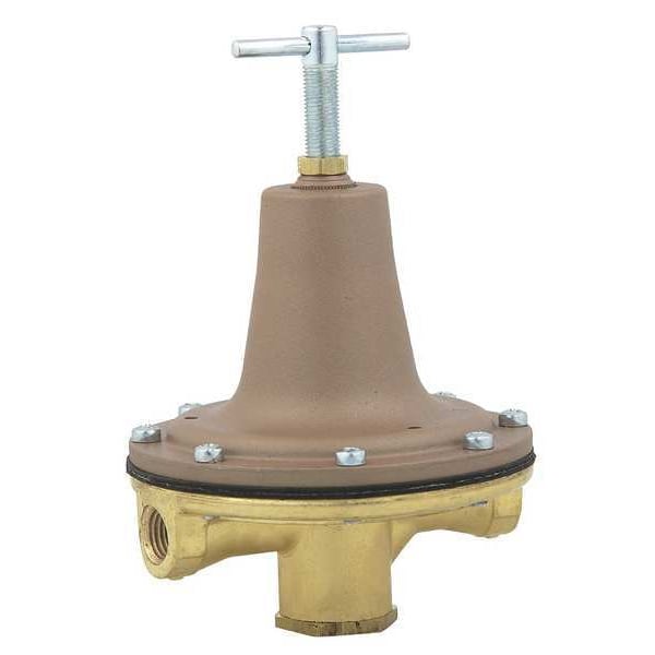 Pressure Regulator, Series 215, Body Material Brass, Inlet Size 3/8 in, Outlet Size 3/8 in, Length 4 1/4 in, Height 6 in, Application Commercial Use, Residential Use, Connection Type FNPT, Pressure Adjustment Range 0 to 50 psi, Gauge Port Size Not Applicable, Seal Material Buna-N, Max. Temp. 120 Degrees F, Pipe Size 3/8 in, Max. Pressure 300 psi, Compliance Lead Free