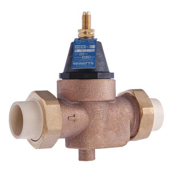 Water Pressure Reducing Valve, Valve Type Standard, Strainer Yes, Material Lead Free Copper Silicon Alloy, Pipe Size 3/4 in., Preset Pressure Settings 50 psi, Pressure Adjustment Range 25 to 75 psi, Connection Type Union x Joint, Height 6-1/4 in., Length 4-1/4 in., Max. Temp. 160 Degrees F, Max. Pressure 300 psi, Standards ASSE 1003, ANSI A112.26.2, CSA B356, Compliance ANSI/NSF 61 Annex G, IAPMO, City of Los Angeles