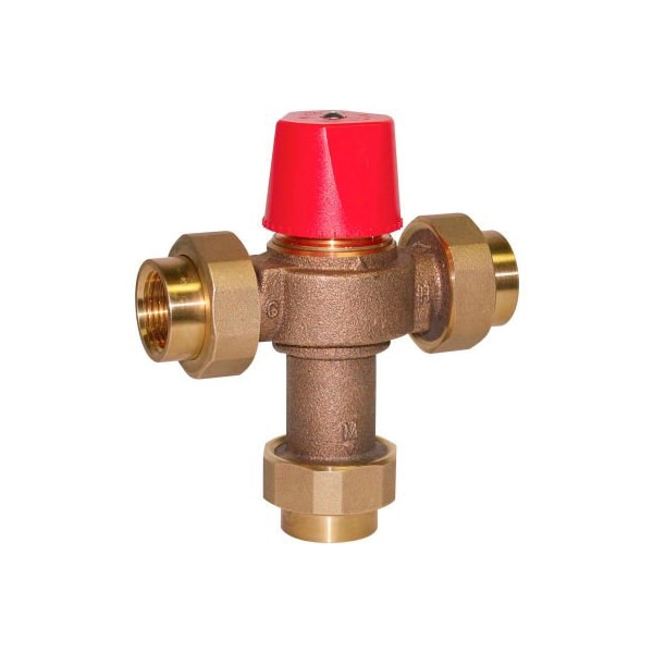 Watts 0559101 1/2" tempering control valve this 1/2 inch lead free hot water control valve is designed for installation on water heating equipment to provide tempered water to point-of-use fixtures and is ideal for radiant heat applications. The double throttling design combines hot and cold water control for a sensitive response to water temperature changes in the mixing chamber. It consists of a lead free brass body, threaded union connections, solid wax hydraulic principle thermostat, integral filter washers and check valves, virtual shutoff upon loss of cold water supply, and a locking mechanism for the temperature setting. The maximum pressure is 150 psi (10.3 bar). The adjustable field range temperature is 90 to 160 degrees f (32 to 71 degrees c).
