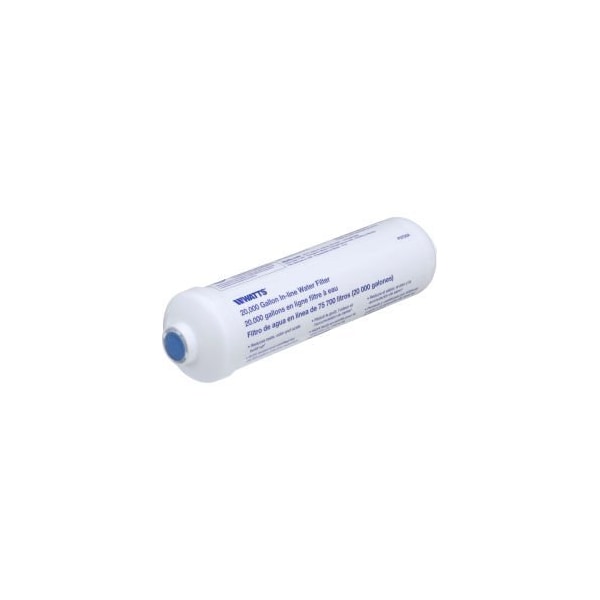 WATTS 20,000 GALLON INLINE 10" CARBON FILTER W/FITTINGS THIS WATTS FILTER HAS A RATING OF 20,000-GAL INLINE 10" CARBON FILTER AND NECESSARY FITTINGS FOR EASY INSTALL. WATTS IN-LINE WATER FILTER KIT IS DESIGNED TO REDUCE CHLORINE AND ODORS FROM WATER TO IMPROVE TASTE. IDEAL FOR REFRIGERATORS, ICE MAKERS, UNDER SINK FILTERS AND BEVERAGE DISPENSERS.
