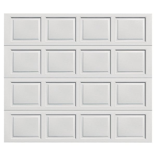 Installs and operates easily with virtually no maintenance Uninsulated Galvanized steel panels, woodgrain textured, raised panel design with 2coat, bakedon polyester finish 2 thick door sections with boxshaped 20gauge stiles add strength and rigidity Snug fitting tongueandgroove section joints help seal out wind and blowing rain Full width steel bottom rail has factoryinstalled shaped weatherseal Weatherseal blocks drafts and helps save energy remains flexible even in extreme cold SilentGlide rollers with nylon tires and solid steel shafts TorqueMaster Plus counterbalance system seals springs safely within a steel tube to help prevent injury Heavygauge steel wraparound end caps trimout door edges White Does not come with locking mechanism Door comes with 2 boxes banded together Doors ship in total pack Total pack is a 2 box system that has the door in 2 boxes Includes Sections, track, springs, and hardware